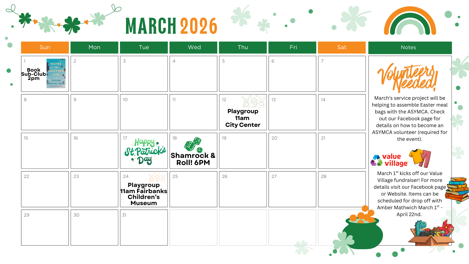 March's service project will be helping to assemble Easter meal bags with the ASYMCA. Check out our Facebook page for details on how to become an ASYMCA volunteer (required for the event).